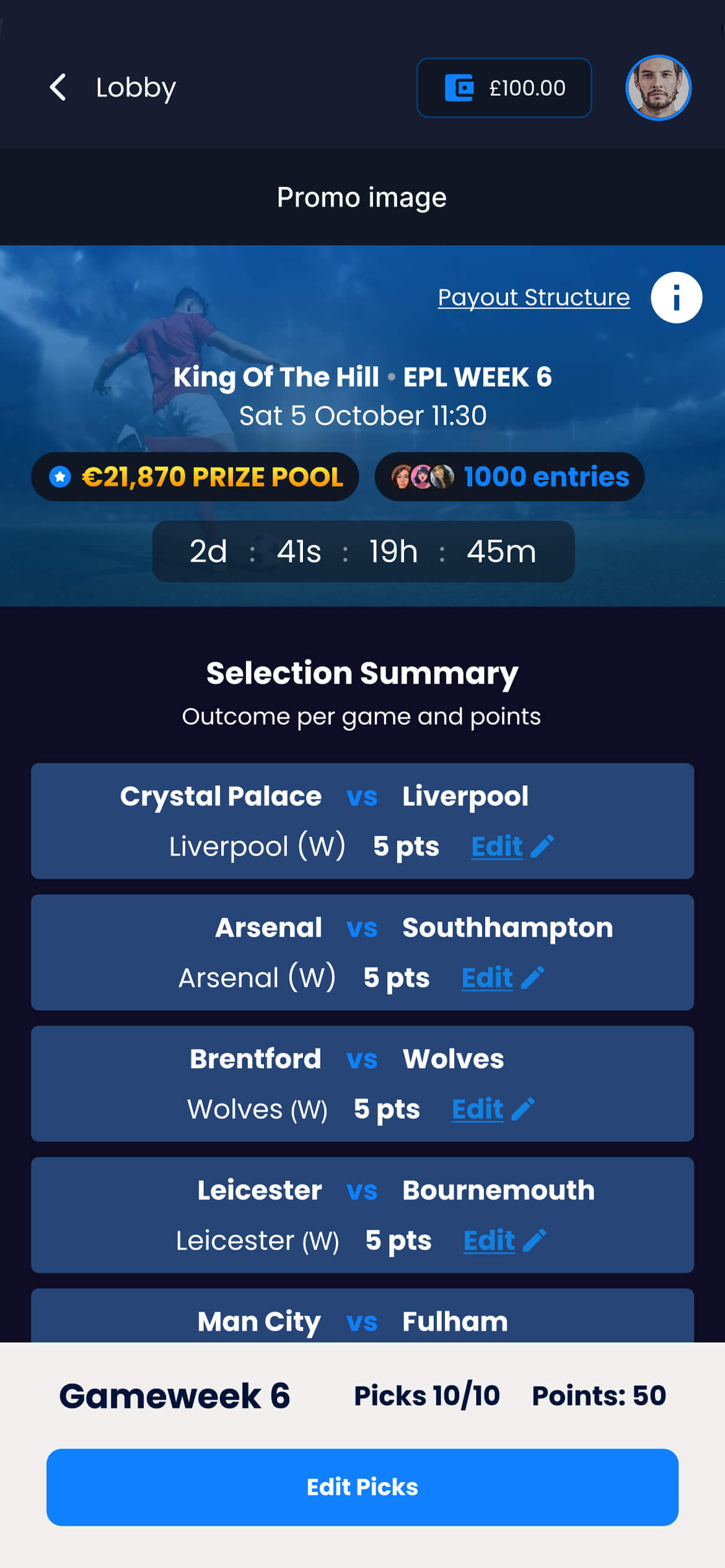 - Blends traditional pool betting, accumulator mechanics, and DFS scoring into a simple to play peer v peer contest